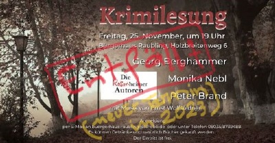25. November: Bürgerhaus Raubling, Holzbreitenweg 6 (Krimilesung mit Peter Brand, Monika Nebl und Georg Berghammer). Ersatztermin (da leider wg, Krankheit ausgefallen): 28. April 2023 - s. u. 28. November, 19 Uhr: Simseeklinik, Bad Endorf (nur für Patienten möglich).
