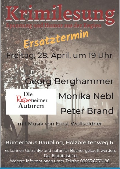 28. April, 19:00 Krimilesung im Bürgerhaus Raubling, mit Monika Nebl, Georg Berghammer und Peter Brand, (Die Rosenheimer Autoren) sowie musikalische Begleitung -